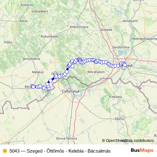 The first stop of the 5043 bus route is Bácsalmás, autóbusz-állomás and the last stop is Szeged, autóbusz-állomás. 5043 (Szeged - Öttömös - Kelebia - Bácsalmás) is operational during everyday.