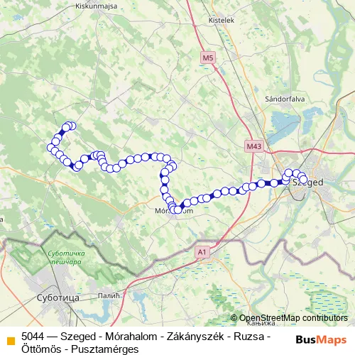 The first stop of the 5044 bus route is Pusztamérges, Volán telep and the last stop is Szeged, autóbusz-állomás. 5044 (Szeged - Mórahalom - Zákányszék - Ruzsa - Öttömös - Pusztamérges) is operational during everyday.