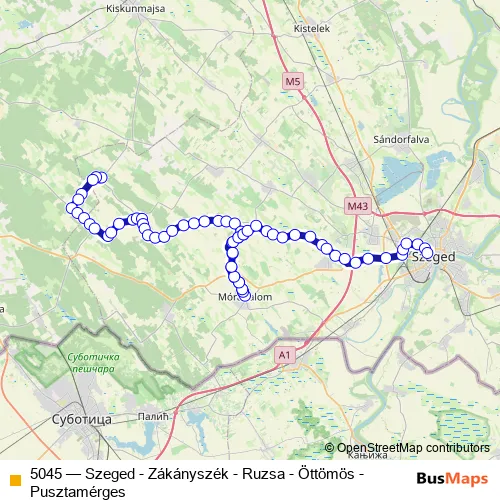The first stop of the 5045 bus route is Pusztamérges, Volán telep and the last stop is Szeged, autóbusz-állomás. 5045 (Szeged - Zákányszék - Ruzsa - Öttömös - Pusztamérges) is operational during everyday.