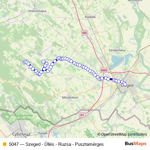 The first stop of the 5047 bus route is Pusztamérges, autóbusz-forduló and the last stop is Szeged, autóbusz-állomás. 5047 (Szeged - Üllés - Ruzsa - Pusztamérges) is operational during everyday.
