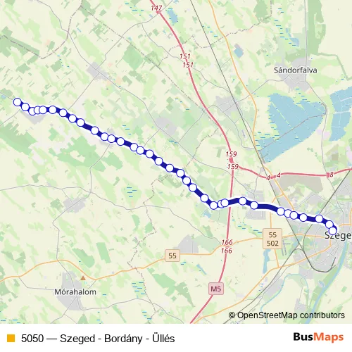 The first stop of the 5050 bus route is Üllés, Halasi csatorna and the last stop is Szeged, autóbusz-állomás. 5050 (Szeged - Bordány - Üllés) is operational during everyday.