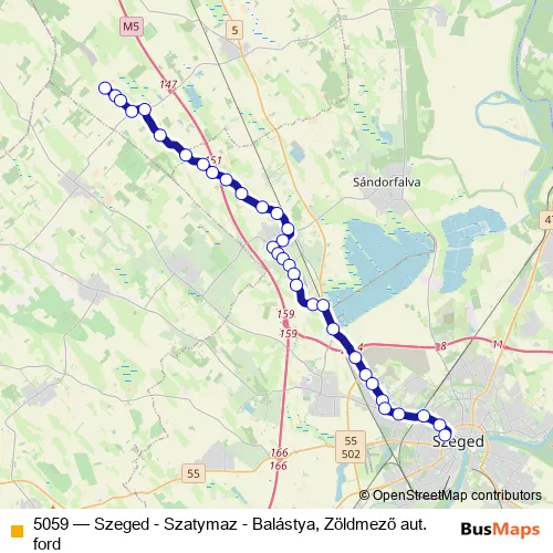 Services on the 5059 - Szeged - Szatymaz - Balástya, Zöldmező aut. ford bus stop at 16:55 on Monday, Tuesday, Wednesday, Thursday, Friday, Saturday, Sunday.
