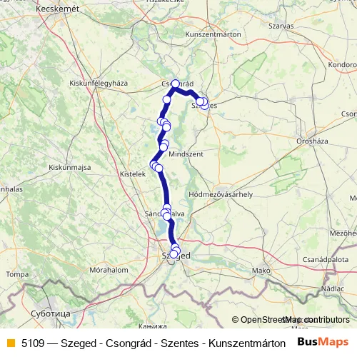 The first stop of the 5109 bus route is Szentes, autóbusz-állomás and the last stop is Szeged, autóbusz-állomás. 5109 (Szeged - Csongrád - Szentes - Kunszentmárton) is operational during everyday.