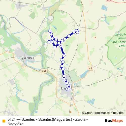 The first stop of the 5121 bus route is Szentes, autóbusz-állomás and the last stop is Nagytőke, községháza. 5121 (Szentes - Szentes(Magyartés) - Zalota - Nagytőke) is operational during everyday.