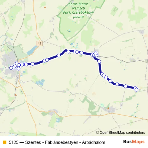 The first stop of the 5125 bus route is Szentes, autóbusz-állomás and the last stop is Árpádhalom, magtároló. 5125 (Szentes - Fábiánsebestyén - Árpádhalom) is operational during everyday.