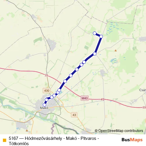 The first stop of the 5167 bus route is Makó (Rákos), autóbusz-váróterem and the last stop is Makó, Csurgói-híd. 5167 (Hódmezővásárhely - Makó - Pitvaros - Tótkomlós) is operational during everyday.