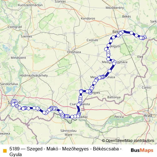 The first stop of the 5189 bus route is Gyula, Tiborc utca 14. (Várfürdő) and the last stop is Szeged, vasútállomás. 5189 (Szeged - Makó - Mezőhegyes - Békéscsaba - Gyula) is operational during everyday.