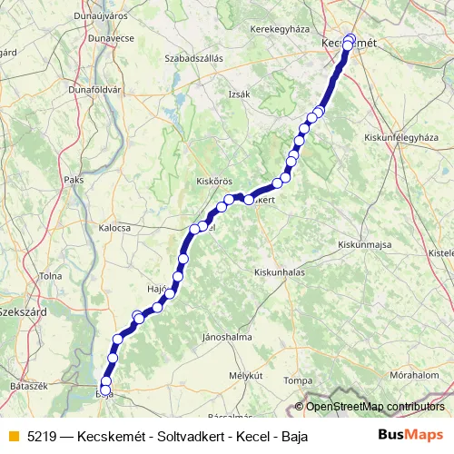 The first stop of the 5219 bus route is Kecskemét, autóbusz-állomás and the last stop is Baja, autóbusz-állomás. 5219 (Kecskemét - Soltvadkert - Kecel - Baja) is operational during everyday.