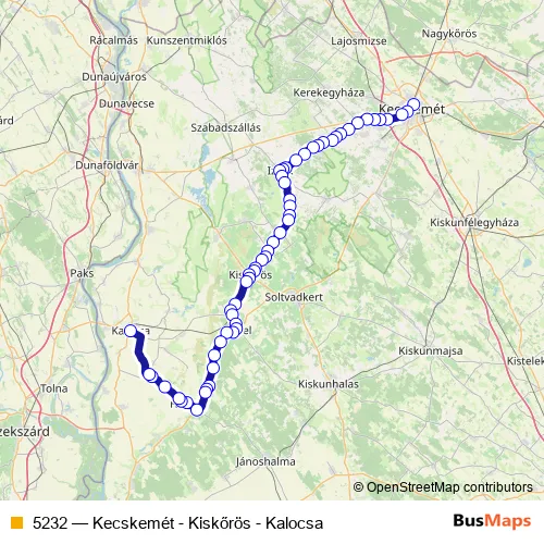 The first stop of the 5232 bus route is Kecskemét, autóbusz-állomás and the last stop is Kalocsa, autóbusz-állomás. 5232 (Kecskemét - Kiskőrös - Kalocsa) is operational during everyday.