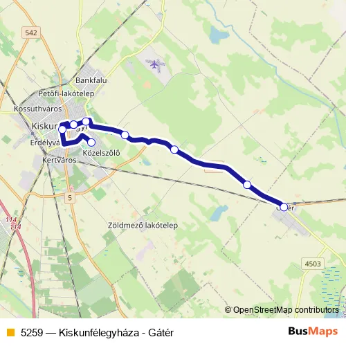 The first stop of the 5259 bus route is Kiskunfélegyháza, Platán iskola and the last stop is Gátér, községháza. 5259 (Kiskunfélegyháza - Gátér) is operational during on weekdays.