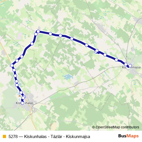 The first stop of the 5278 bus route is Kiskunhalas, autóbusz-állomás and the last stop is Kiskunmajsa, autóbusz-váróterem. 5278 (Kiskunhalas - Tázlár - Kiskunmajsa) is operational during everyday.