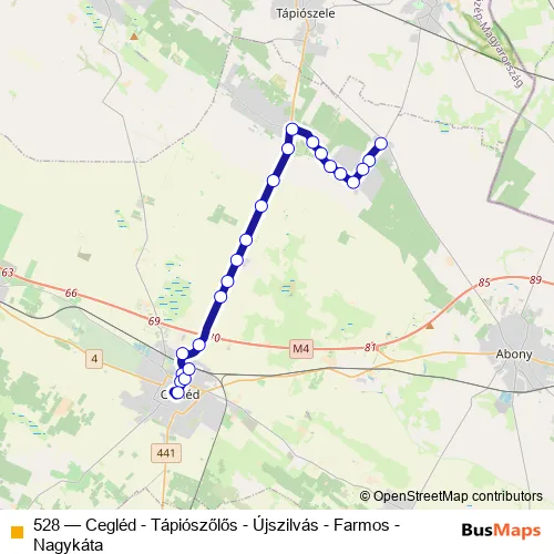The first stop of the 528 bus route is Újszilvás, Jeges and the last stop is Cegléd, autóbusz-állomás. 528 (Cegléd - Tápiószőlős - Újszilvás - Farmos - Nagykáta) is operational during everyday.