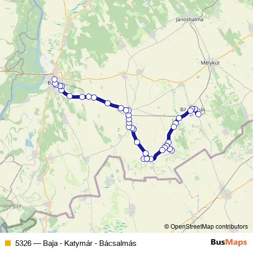 The first stop of the 5326 bus route is Bácsalmás, vasútállomás and the last stop is Baja, autóbusz-állomás. 5326 (Baja - Katymár - Bácsalmás) is operational during everyday.