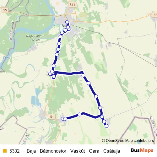 The first stop of the 5332 bus route is Csátalja, autóbusz-váróterem and the last stop is Baja, autóbusz-állomás. 5332 (Baja - Bátmonostor - Vaskút - Gara - Csátalja) is operational during on weekdays.