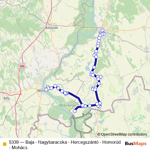 The first stop of the 5339 bus route is Baja, autóbusz-állomás and the last stop is Mohács, Újmohácsi Rév. 5339 (Baja - Nagybaracska - Hercegszántó - Homorúd - Mohács) is operational during everyday.