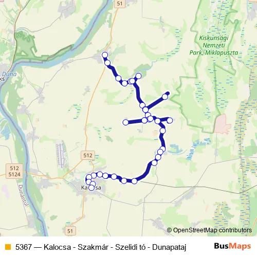 Click here to view the nearest 5367 - Kalocsa - Szakmár - Szelidi tó - Dunapataj bus stop.