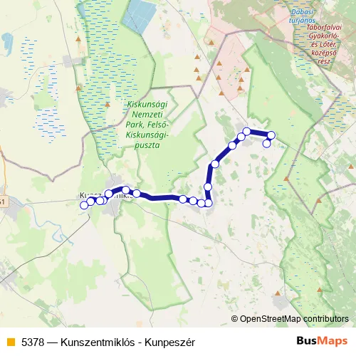 The first stop of the 5378 bus route is Kunpeszér, autóbusz-forduló and the last stop is Kunszentmiklós, vasútállomás. 5378 (Kunszentmiklós - Kunpeszér) is operational during everyday.