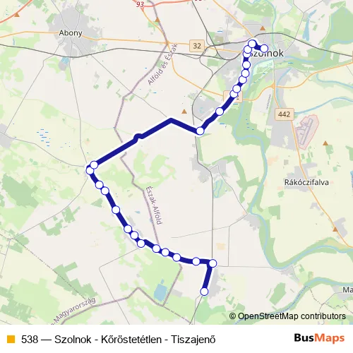 Click here to view the nearest 538 - Szolnok - Kőröstetétlen - Tiszajenő bus stop.