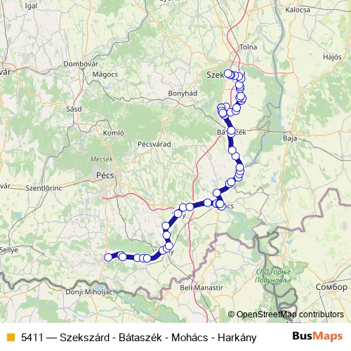 The first stop of the 5411 bus route is Mohács, autóbusz-állomás and the last stop is Szekszárd, autóbusz-állomás. 5411 (Szekszárd - Bátaszék - Mohács - Harkány) is operational during everyday.