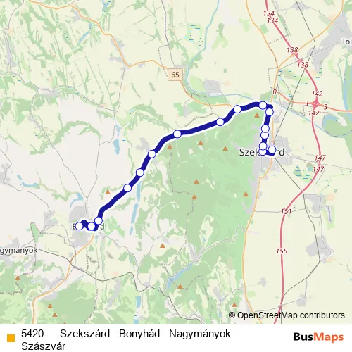 The first stop of the 5420 bus route is Szekszárd, autóbusz-állomás and the last stop is Bonyhád, autóbusz-állomás. 5420 (Szekszárd - Bonyhád - Nagymányok - Szászvár) is operational during everyday.