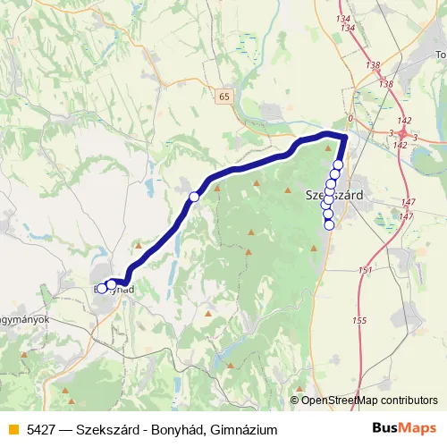 The first stop of the 5427 bus route is Szekszárd, Csatári forduló and the last stop is Bonyhád, Gimnázium. 5427 (Szekszárd - Bonyhád, Gimnázium) is operational during on weekdays.