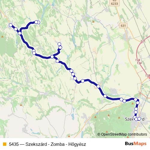 The first stop of the 5435 bus route is Szekszárd, autóbusz-állomás and the last stop is Hőgyész, autóbusz-váróterem. 5435 (Szekszárd - Zomba - Hőgyész) is operational during everyday.