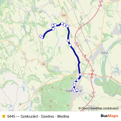 The first stop of the 5445 bus route is Medina, Iskola and the last stop is Szekszárd, autóbusz-állomás. 5445 (Szekszárd - Szedres - Medina) is operational during everyday.