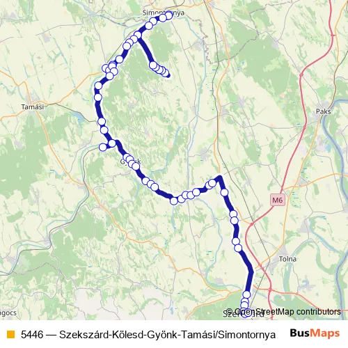 The first stop of the 5446 bus route is Simontornya, autóbusz-váróterem and the last stop is Gyönk, autóbusz-állomás. 5446 (Szekszárd-Kölesd-Gyönk-Tamási/Simontornya) is operational during everyday.