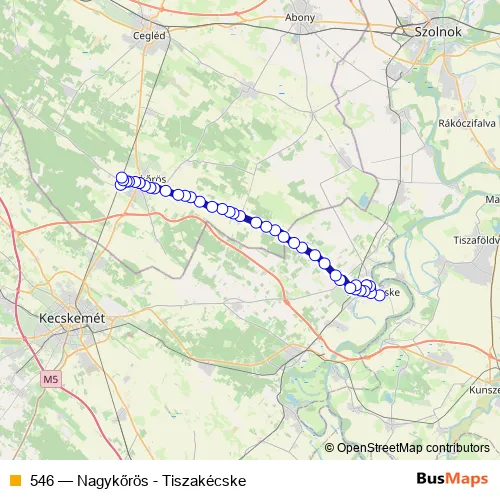 The first stop of the 546 bus route is Tiszakécske, Templom tér and the last stop is Nagykőrös, vasútállomás. 546 (Nagykőrös - Tiszakécske) is operational during everyday.
