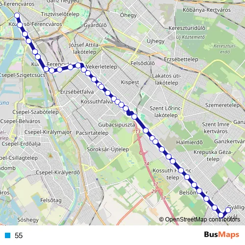 The first stop of the 55 bus route is Boráros tér H and the last stop is Rákóczi Ferenc utca. 55 is operational during everyday.