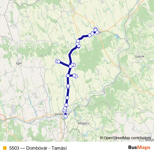 The first stop of the 5503 bus route is Dombóvár, autóbusz-állomás and the last stop is Tamási, vasútállomás. 5503 (Dombóvár - Tamási) is operational during everyday.