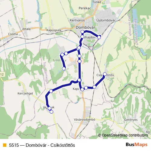The first stop of the 5515 bus route is Csikóstőttős, autóbusz-váróterem and the last stop is Dombóvár, autóbusz-állomás. 5515 (Dombóvár - Csikóstőttős) is operational during everyday.