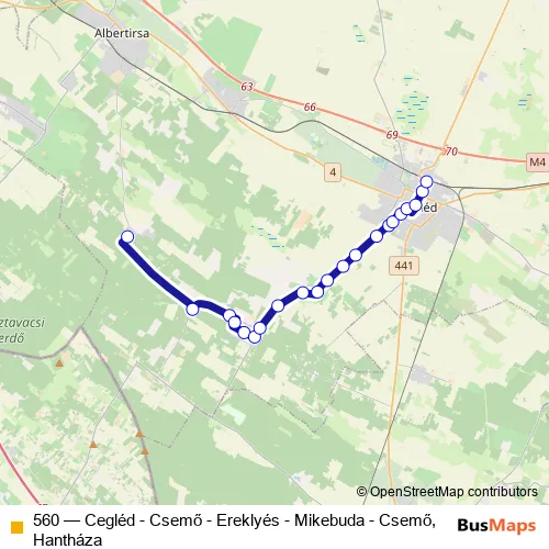 The first stop of the 560 bus route is Mikebuda, községháza and the last stop is Cegléd, autóbusz-állomás. 560 (Cegléd - Csemő - Ereklyés - Mikebuda - Csemő, Hantháza) is operational during everyday.