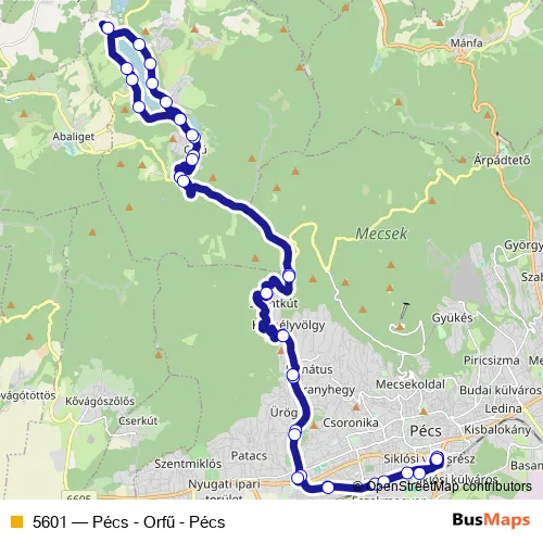 The first stop of the 5601 bus route is Pécs, autóbusz-állomás and the last stop is Pécs, autóbusz-állomás. 5601 (Pécs - Orfű - Pécs) is operational during on weekdays.