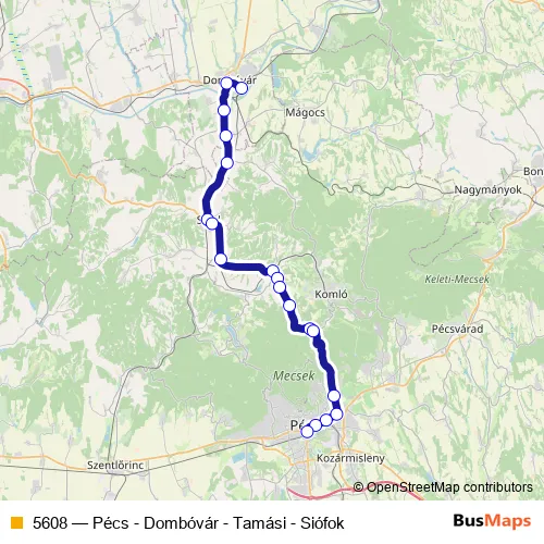 The first stop of the 5608 bus route is Dombóvár, autóbusz-állomás and the last stop is Pécs, autóbusz-állomás. 5608 (Pécs - Dombóvár - Tamási - Siófok) is operational during everyday.