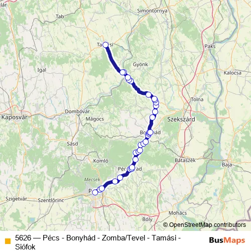 The first stop of the 5626 bus route is Siófok, autóbusz-állomás and the last stop is Pécs, autóbusz-állomás. 5626 (Pécs - Bonyhád - Zomba/Tevel - Tamási - Siófok) is operational during everyday.