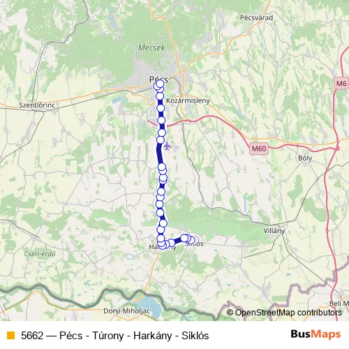 The first stop of the 5662 bus route is Siklós, autóbusz-állomás and the last stop is Pécs, autóbusz-állomás. 5662 (Pécs - Túrony - Harkány - Siklós) is operational during everyday.