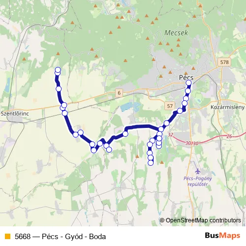 The first stop of the 5668 bus route is Pécs, autóbusz-állomás and the last stop is Boda, forduló. 5668 (Pécs - Gyód - Boda) is operational during everyday.