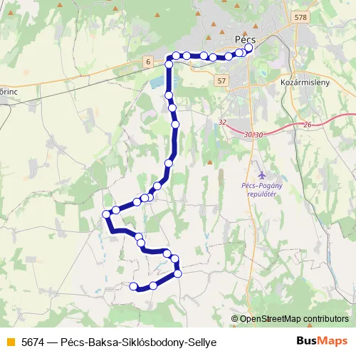 The first stop of the 5674 bus route is Pécs, autóbusz-állomás and the last stop is Siklósbodony, forduló. 5674 (Pécs-Baksa-Siklósbodony-Sellye) is operational during on weekdays.