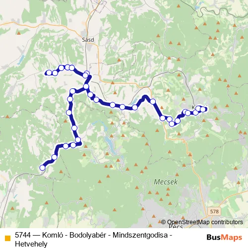 Bus 5744 - Komló - Bodolyabér - Mindszentgodisa - Hetvehely in Sasd: Stops & Timetable