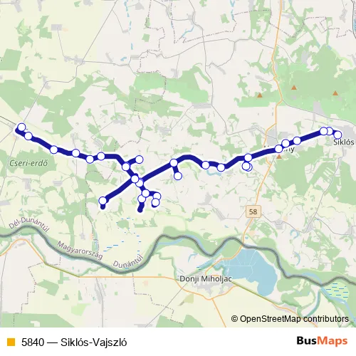 The first stop of the 5840 bus route is Siklós, autóbusz-állomás and the last stop is Vajszló, autóbusz-váróterem. 5840 (Siklós-Vajszló) is operational during everyday.