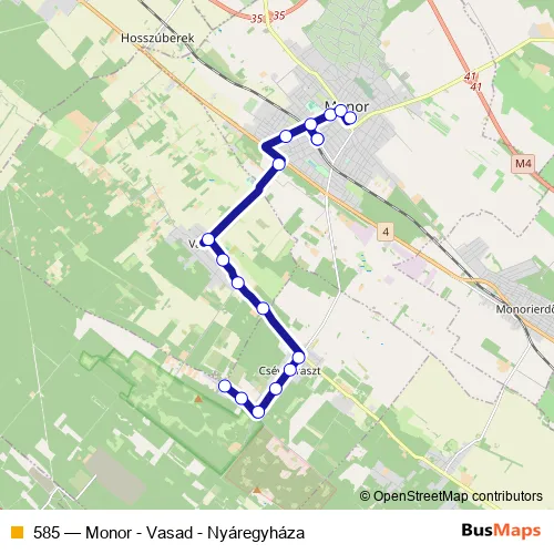The first stop of the 585 bus route is Csévharaszt, autóbusz-forduló and the last stop is Monor, autóbusz-állomás. 585 (Monor - Vasad - Nyáregyháza) is operational during everyday.