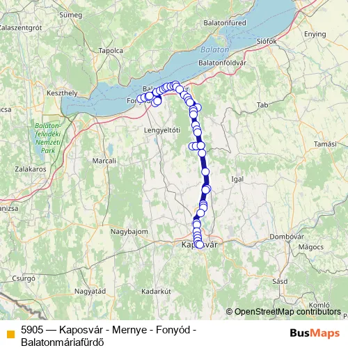 The first stop of the 5905 bus route is Fonyód, vasútállomás and the last stop is Kaposvár, autóbusz-állomás. 5905 (Kaposvár - Mernye - Fonyód - Balatonmáriafürdő) is operational during everyday.