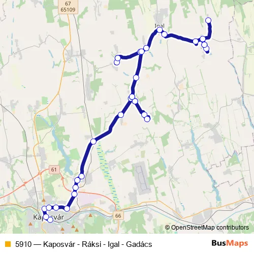 The first stop of the 5910 bus route is Kaposvár, autóbusz-állomás and the last stop is Gadács, autóbusz-váróterem. 5910 (Kaposvár - Ráksi - Igal - Gadács) is operational during everyday.