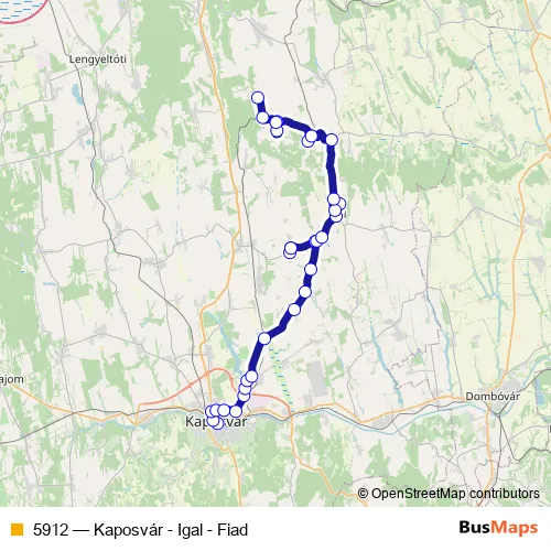 The first stop of the 5912 bus route is Igal, Posta and the last stop is Fiad, autóbusz-váróterem. 5912 (Kaposvár - Igal - Fiad) is operational during everyday.