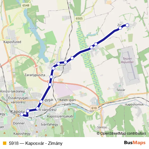 The first stop of the 5918 bus route is Zimány, Templom and the last stop is Kaposvár, autóbusz-állomás. 5918 (Kaposvár - Zimány) is operational during everyday.