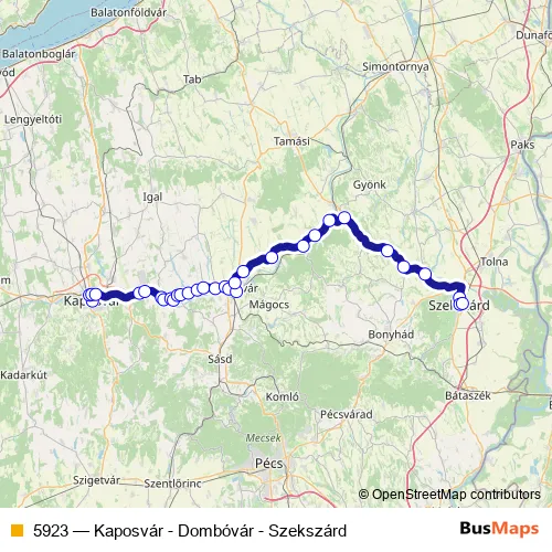 The first stop of the 5923 bus route is Kaposvár, autóbusz-állomás and the last stop is Szekszárd, autóbusz-állomás. 5923 (Kaposvár - Dombóvár - Szekszárd) is operational during everyday.