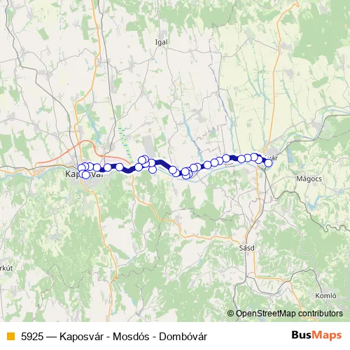 The first stop of the 5925 bus route is Dombóvár, autóbusz-állomás and the last stop is Kaposvár, autóbusz-állomás. 5925 (Kaposvár - Mosdós - Dombóvár) is operational during everyday.
