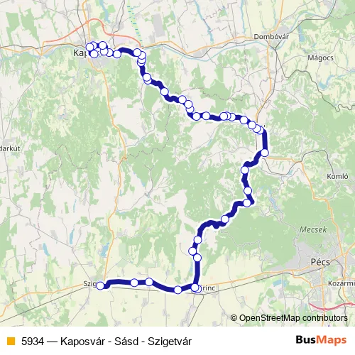 The first stop of the 5934 bus route is Szigetvár, autóbusz-állomás and the last stop is Kaposvár, autóbusz-állomás. 5934 (Kaposvár - Sásd - Szigetvár) is operational during everyday.