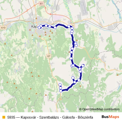 The first stop of the 5935 bus route is Kaposvár, autóbusz-állomás and the last stop is Gálosfa, Felső. 5935 (Kaposvár - Szentbalázs - Gálosfa - Bőszénfa) is operational during everyday.